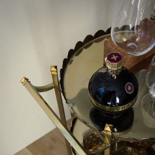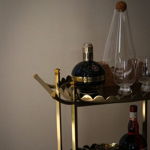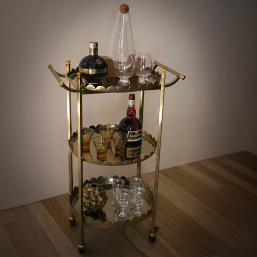 This Iconic 1940s brass bar cart, with its scalloped detailing and elegant proportions, captures the glamour of mid-century American entertaining and the golden era of cocktails. The scalloped edges, a nod to the ornate yet restrained decorative motifs of the era, blending functionality with sculptural beauty. The mirrored tiers reflect the golden glow of the brass frame, enhancing the play of light—perfect for showcasing a well-appointed spirits collection. Bar carts like this became an essential fixture of sophisticated entertaining in the postwar years, a symbol of conviviality and effortless hospitality.