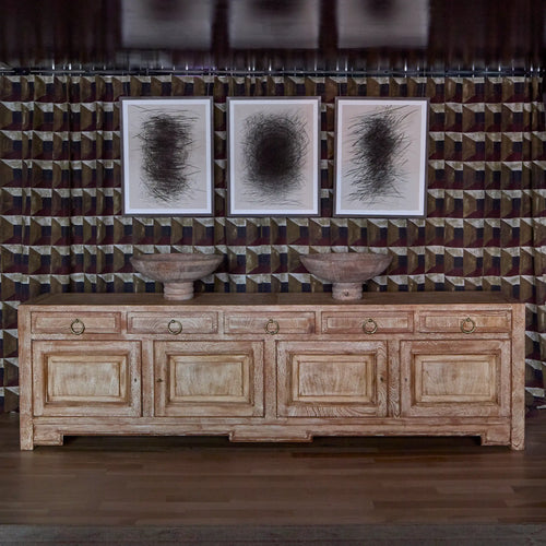 Its balanced design features five drawers above four paneled doors, all with original bronze pulls. Offering generous hidden storage, it combines function with an elegant, architectural look—ideal for a dining room, entry, or living space.