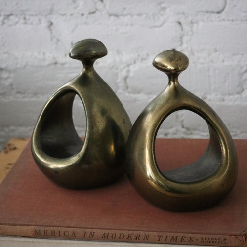 These Ben Seibel brass stirrup bookends, designed for Jenfred Ware in the 1950s, are a striking example of mid-century sculptural design. Seibel, a prolific American designer known for his work in ceramics, furniture, and metalware, brought a distinctive biomorphic approach to everyday objects. His designs, often inspired by the organic modernism of artists like Jean Arp and Constantin Brancusi, merged fluid, abstract forms with functional purpose.