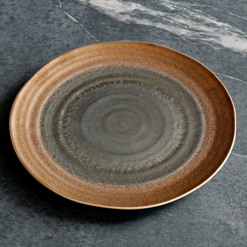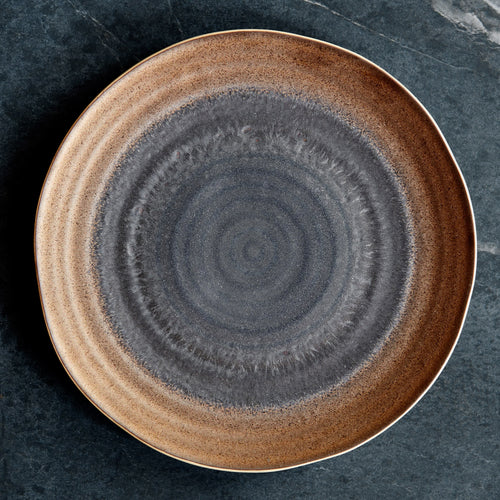 The "Akita" dinner set is a stunning homage to the rich tradition of Japanese ceramics, elegantly reimagined through a modern California lens. Each piece showcases a dynamic reactive glaze that creates a harmonious interplay of depth and texture, accentuated by subtle copper highlights. This luminous quality gives the collection a refined and organic feel, making it perfect for luxury entertaining. The earthy tones and concentric patterns evoke a sense of calm and balance, embodying both the precision of Japanese craftsmanship and the effortless sophistication of modern California design. With its unique glow and timeless appeal, "Akita" transforms any table setting into an artful experience.