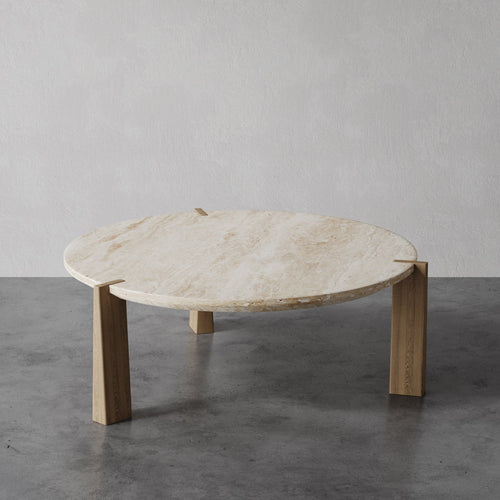 Influenced by Pierre Chapo’s honest craftsmanship and Charlotte Perriand’s humanist modernism, the Aline Wedge-Leg Coffee Table pairs solid oak and hand-selected travertine in a composition of balance and proportion. Sculptural legs lift the stone top lightly, allowing its veining and texture to bring warmth and subtle motion to the room. An artisan-crafted coffee table that anchors living spaces with exotic material beauty.