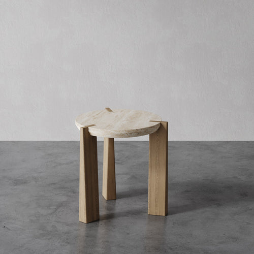 The Aline Wedge-Leg Side Table brings architectural clarity to a smaller scale. A hand-finished travertine top rests on three wedge-cut solid oak legs, balancing form and material warmth. Each stone surface reveals unique natural veining, adding depth and texture. Designed to complement the Aline coffee table, it anchors living rooms, bedrooms, and lounge spaces with proportion and craft.
