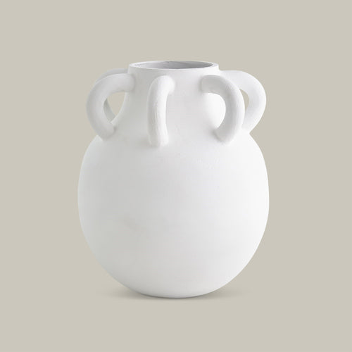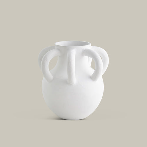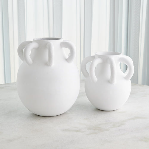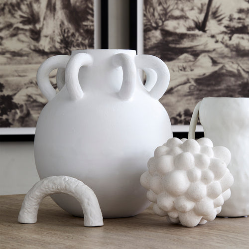 Elevate your space with the dramatic Loop Amphora Vase; designed with mesmerizing graphic loop handles. Its pristine hand applied finish adds a layer of texture and decor to any setting. The graceful loops, meticulously hand crafted with artistic integrity, add to the silhouette, transforming this vase into a true work of art. Crafted from cast aluminum and finished in a soft white hue.