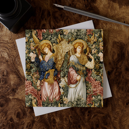 Drawing on the golden reverence of Byzantine art and the handcrafted legacy of Arts and Crafts master William Morris, Angel's Jubilee glows with celestial light in lapis and gold. Angels unfold their wings amid a garden of divine flora. A luxury greeting card, printed on fine art linen paper with a white envelope, ready to give. Pairs beautifully with our matching gift wrap paper.