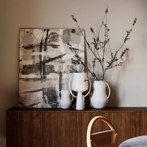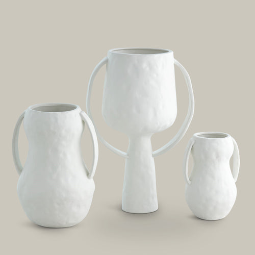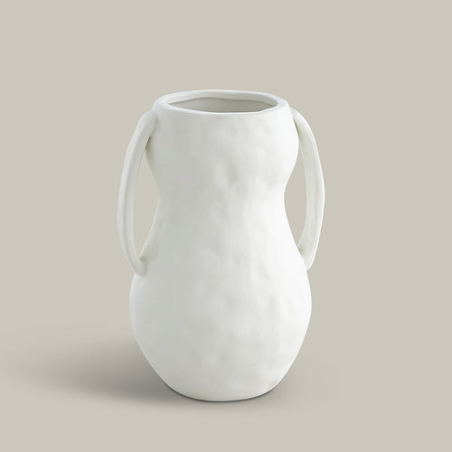 The Aquitaine Vase has modern charm with a touch of the past. The smooth and understated matte finish accentuates its clean lines and graceful curves, creating a refined and modern aesthetic. The ribbon handles, adding a subtle decorative touch, lend a sense of design and allow for easy handling, making it a versatile and beautiful centerpiece. Available in matte white and matte black.