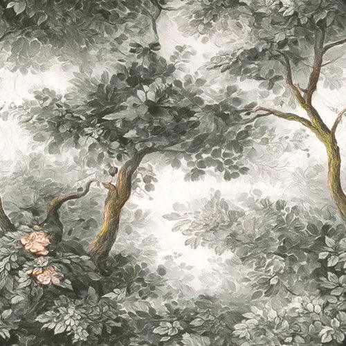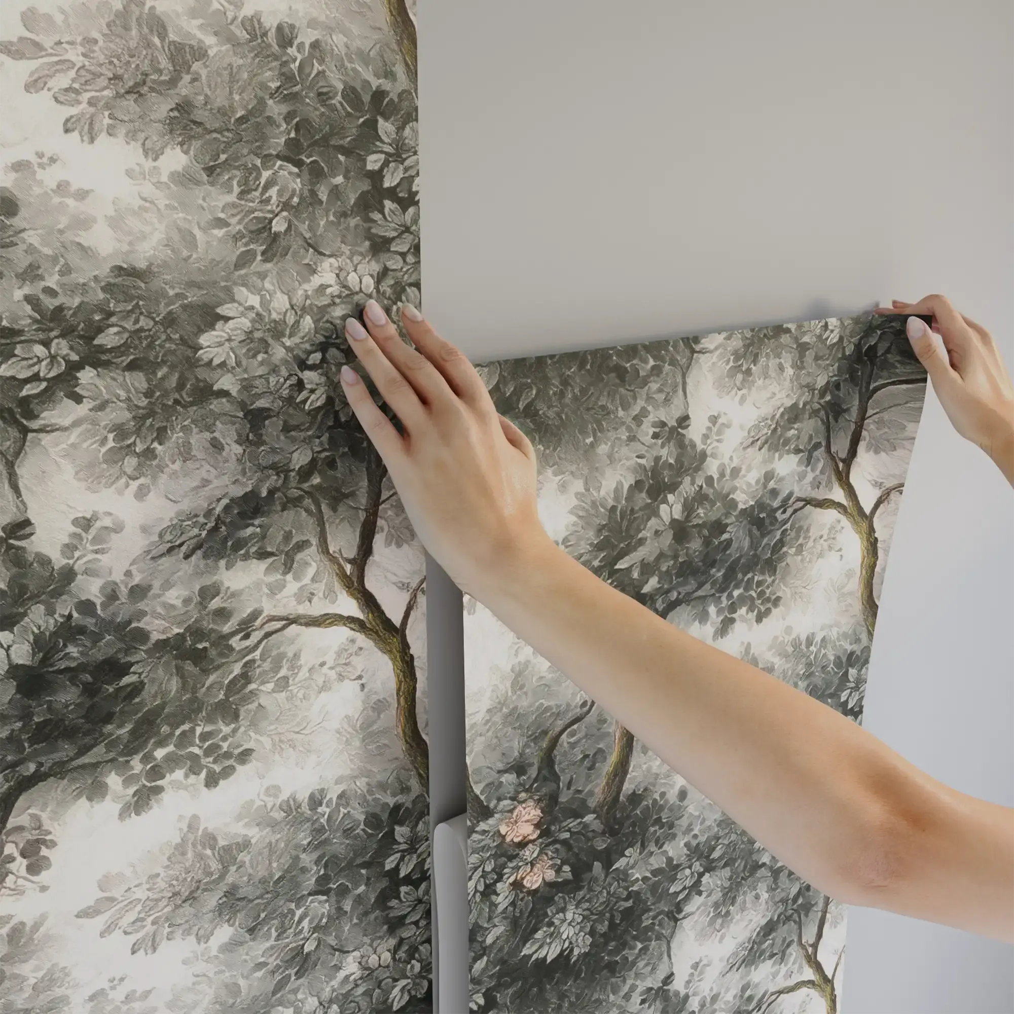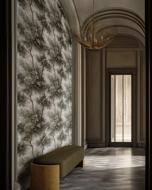 A poetic study of light and shadow, Arbor evokes the grandeur of 18th-century French papier peint panoramas and the dreamlike gardens of chinoiserie salons. Rendered in soft grayscale with touches of gold iridescence, this modern peel and stick wallpaper recalls the hand-painted forest scenes that once adorned Parisian townhouses. Subtle yet dramatic, it is perfect for aesthetes craving layered history but also renter-friendly.