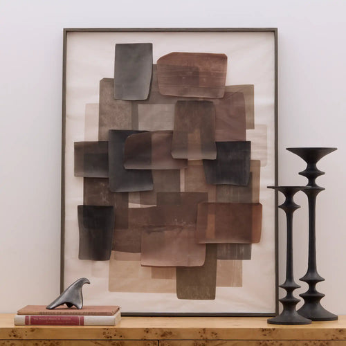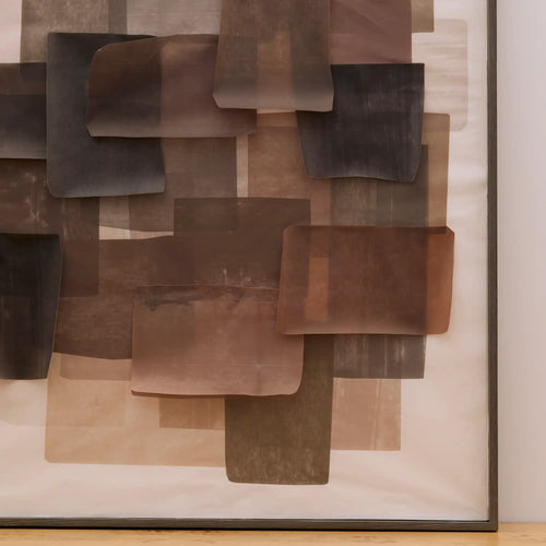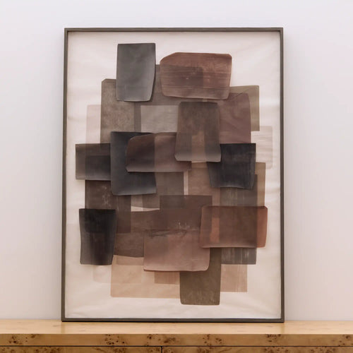 Translucent, textured, and rich with tonal depth, Assemblage en Vellum No. 5 explores the quiet complexity of layered form. Printed vellum sheets in warm earth tones are cut, overlaid, and arranged into a rhythmic grid, allowing each layer to partially reveal the one beneath. The result is a composition that shifts subtly with light—at once architectural and atmospheric.