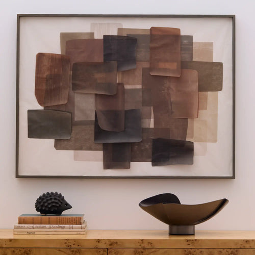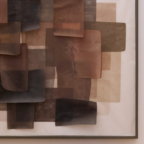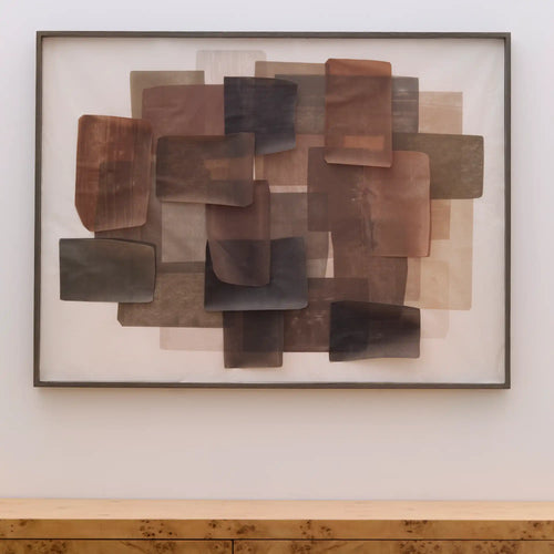 This technique recalls the mid-20th-century explorations of material transparency by artists such as Josef Albers and Anni Albers, where overlapping planes became a study in both color theory and spatial perception. The warm palette of sienna, umber, and charcoal nods to modernist textile design, while the irregular edges lend a sense of organic imperfection.Float-mounted within a shadow box frame without acrylic cover, the work maintains its tactile presence and dimensional depth. At 30” x 40”, it offers a grounded yet ethereal focal point—perfect for collectors who appreciate the interplay of structure and softness.