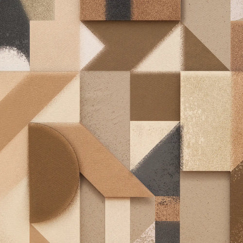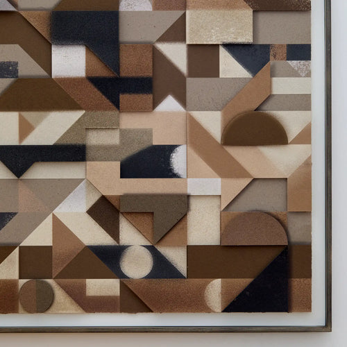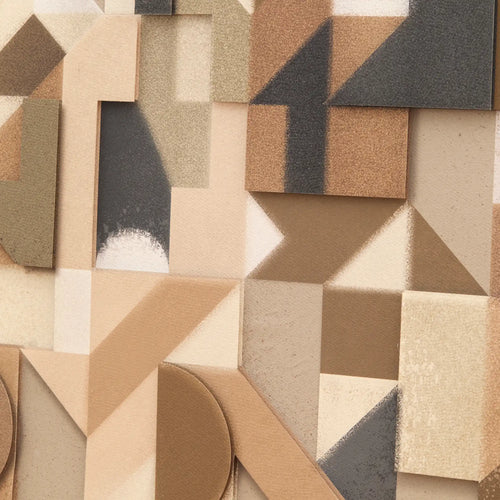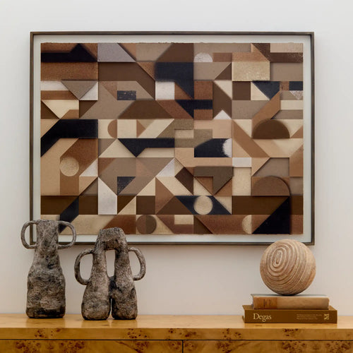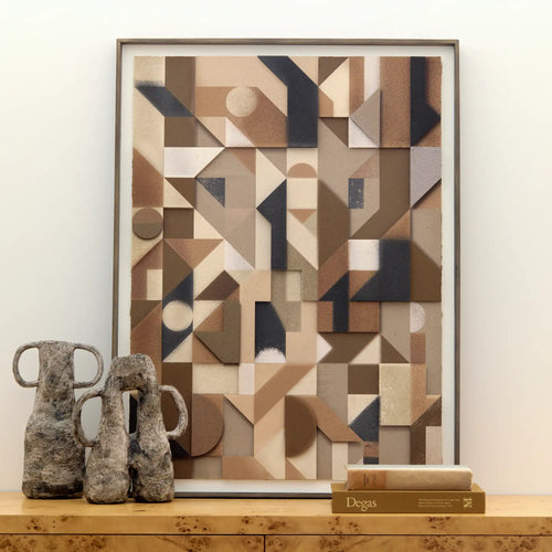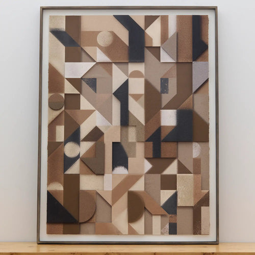 Assemblage Géométrique No. 7 is a bold exploration of geometry, layering, and tonal harmony. Hand-cut and colored paper forms - triangles, circles, and rectangles - interlock across a cream substrate, their overlapping planes creating a sense of rhythm and architectural order. The palette of warm sienna, umber, sand, and black is both timeless and modern, recalling the earthy restraint of early 20th-century European abstraction.