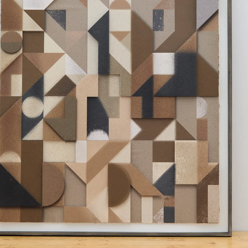 This work pays homage to the Bauhaus and Cubist traditions, where geometry was stripped of ornament to reveal its essential beauty. Echoes of Sonia Delaunay’s color fields and the Constructivist use of form can be felt here, yet the dimensional layering gives it a contemporary sculptural presence. Float-mounted within a shadow box frame without acrylic, the piece allows each surface to catch light and shadow naturally, deepening its spatial effect.At 30” x 40”, it is a commanding statement - ideal for a gallery wall or as a standalone focal piece.