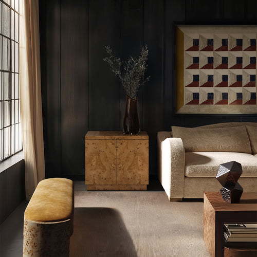 The Lemieux Et Cie Avenir Nightstand in Mappa Burl is quietly designed with a sleek silhouette and luxurious materials. Crafted from natural Mappa burl wood veneer, its warm tones and organic grain patterns create a striking visual. Accented with hand-cast brass hardware, this nightstand offers an elegant balance of form and function, making it a refined bedside companion that enhances both modern and classic interiors. Inside of cabinet contains 1 adjustable shelf for optimal storage flexibility.