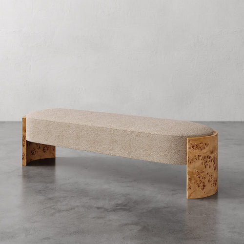 The Benoit Bench features a versatile curved shape, perfect for additional seating in an open-plan living room or as a centerpiece in a hallway. Its gorgeous curved Maple burl legs hug the deep bench seat, which is offered in a variety of luxe fabric options, 2 leg finishes, as well as COM. This bench seamlessly combines functionality with luxury design, making it a standout addition to any home. The Benoit bench is handmade by skilled artisans in North Carolina.
