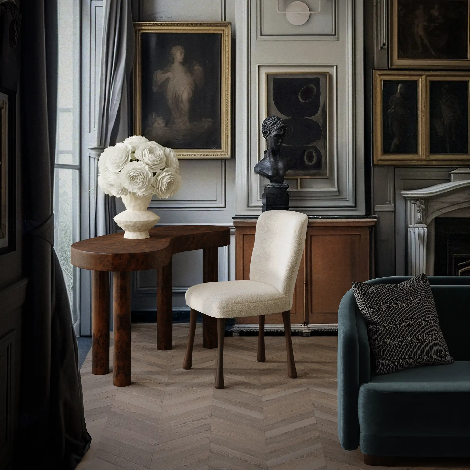 The Brenne Burl Desk reinterprets the iconic kidney-shaped form that first appeared in 16th-century France as a writing desk and evolved through 18th-century English cabinetmaking. Wrapped in luminous mappa burl veneer, its sculptural top rests on pillar-like legs that feel carved from a single gesture. The swirling burl grain brings organic movement and depth, turning a functional workspace into a collectible object of art. Handmade and hand-finished, this burlwood desk is equally suited for the study, vanity, or entryway.
