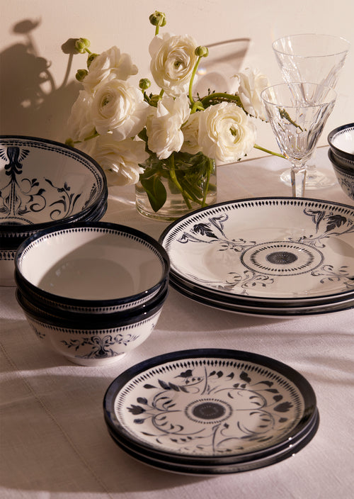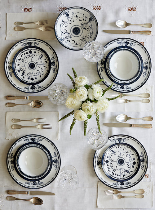 The "Bruges" dinner set draws its inspiration from the timeless beauty of Belgian design and the iconic Dutch Delftware, reinterpreted through a modern lens to enhance contemporary luxury dining. Its elegant hand painted blue and white floral motifs evoke the artisanal craftsmanship of classic European ceramics, while the refined detailing ensures a formal yet versatile aesthetic perfect for any occasion. Whether used for an intimate dinner or grand entertaining, the set marries traditional European artistry with modern decoration, offering both functionality and beauty. The minimal shapes and delicate patterns give each piece an heirloom quality, ideal for elevating any dining experience.