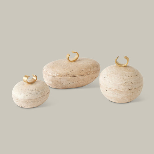 The Caillou Lidded Pot Collection by Lemieux et Cie fuses organic beauty with modern refinement. Crafted from natural travertine stone with polished brass handles, these pebble-like forms offer sculptural storage that’s both functional and artful—perfect alone or in curated groupings.