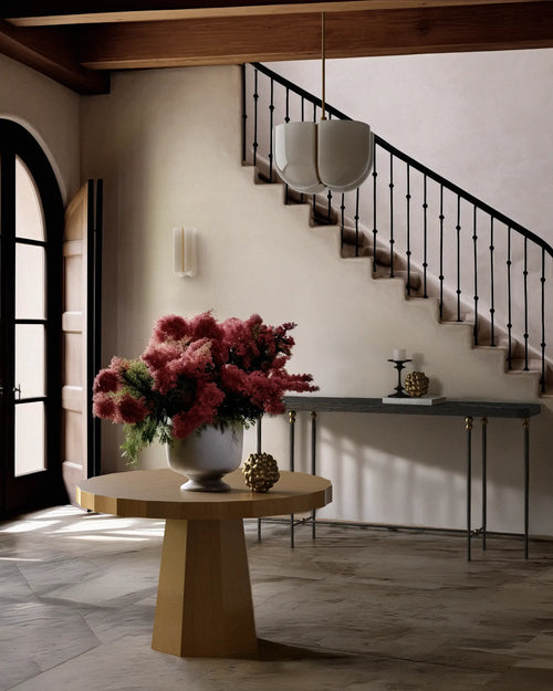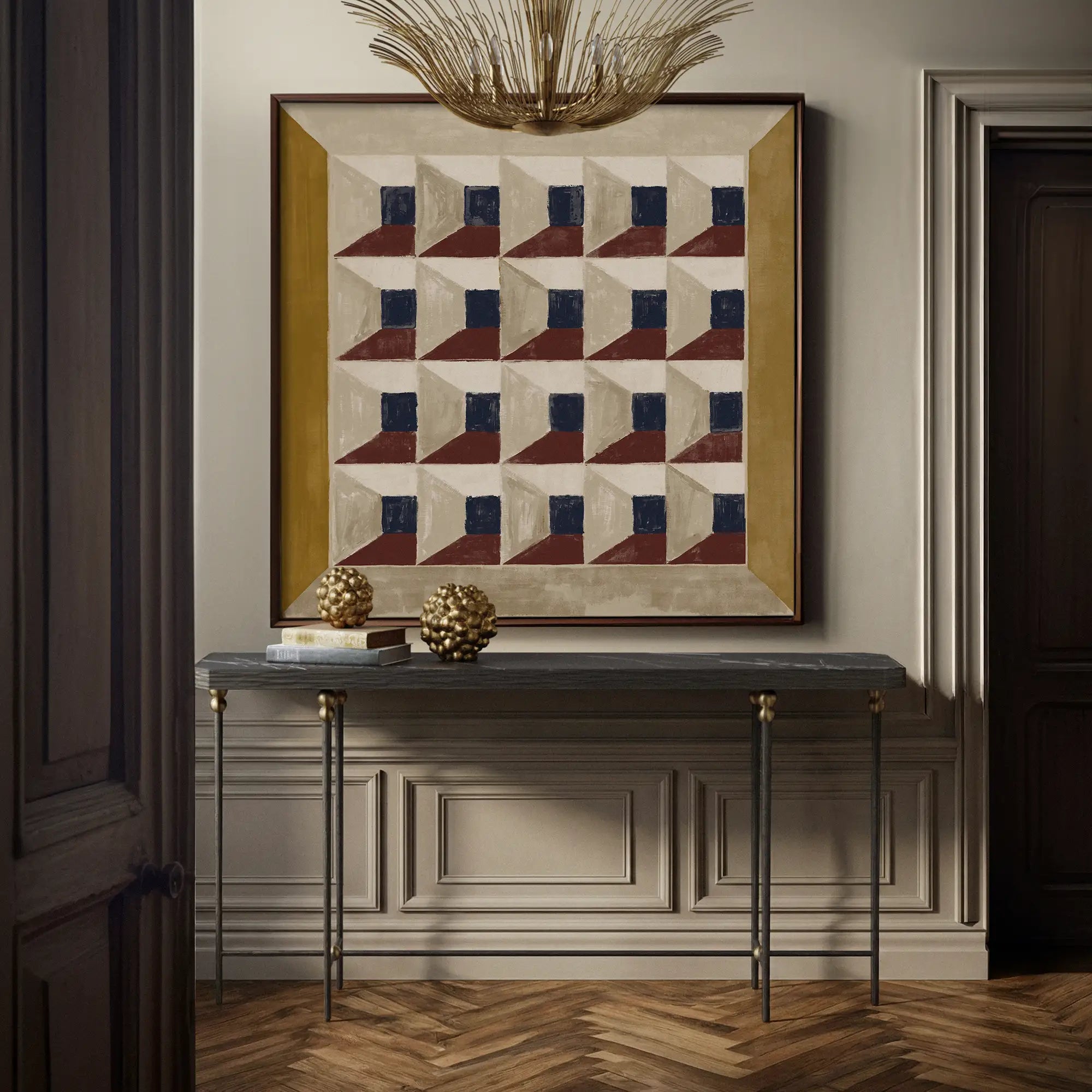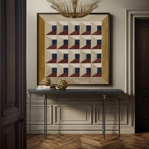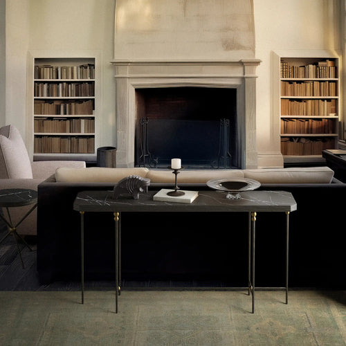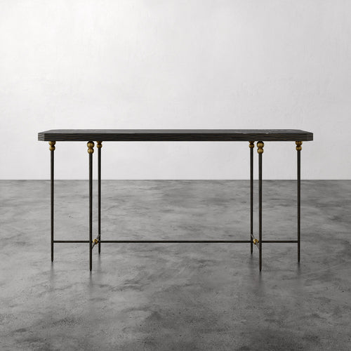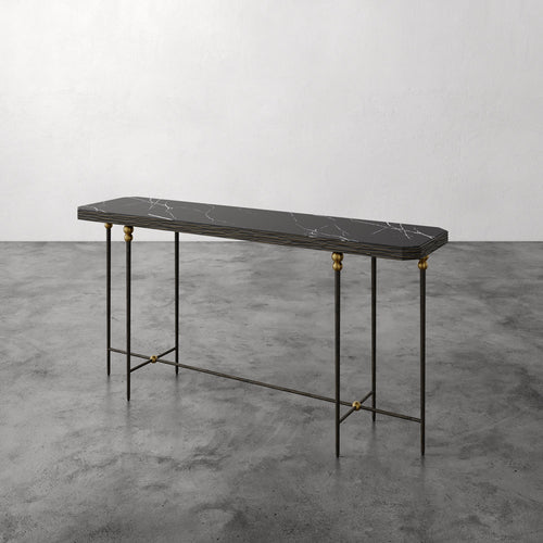 Designed for entryways or transitional spaces, the Cambert Console Table pairs a bronze-finished hammered iron frame with aged brass ball accents and a honed Nero Marquina marble top. The rich black surface with contrasting white veining brings depth and contrast to the design. Drawing from the expressive metal furniture tradition associated with Jean Royère, Cambert brings presence and material depth, creating a refined focal point within the space.