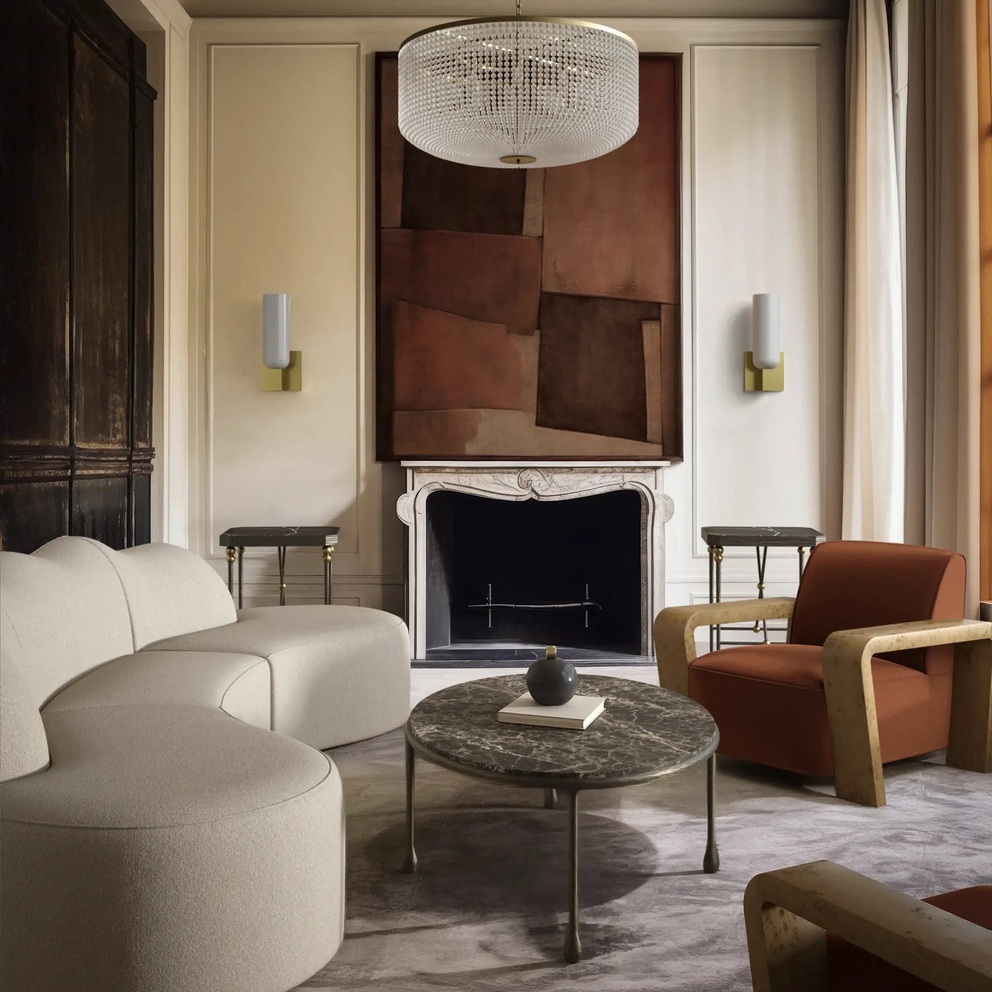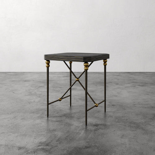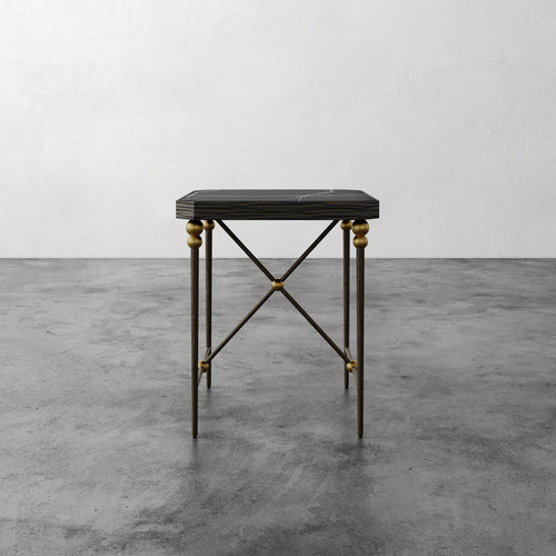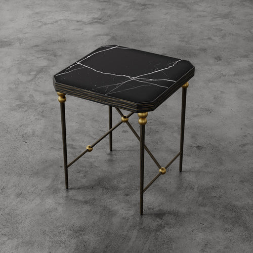 The Cambert Square Side Table draws from postwar French decorative modernism. A bronze-finished hammered iron frame is accented with aged brass ball details and topped with honed Nero Marquina marble, a rich black surface with contrasting white veining. Subtly angled corners and the structural X-base bring balance and clarity to the form. Inspired by the sculptural metalwork tradition associated with Jean Royère, Cambert combines vintage character with a clean, architectural presence.