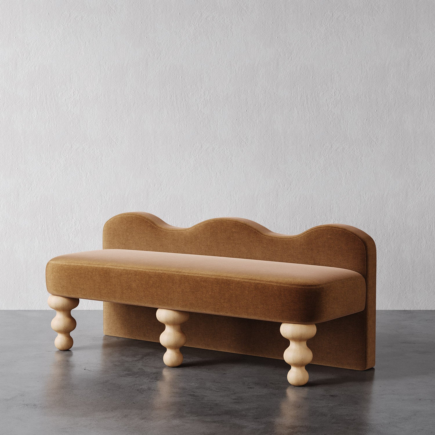 Introducing the Celine Bench, designed with a uniquely shaped scalloped back and solid oak hand-turned legs that complement its elegant curves. Perfectly sized as an end-of-bed bench or for additional seating in a living room or hallway, this bench adds both style and functionality to any space. Available in a variety of luxurious fabrics, the Celine Bench combines timeless design with modern comfort, making it a beautifully crafted addition to your home decor.