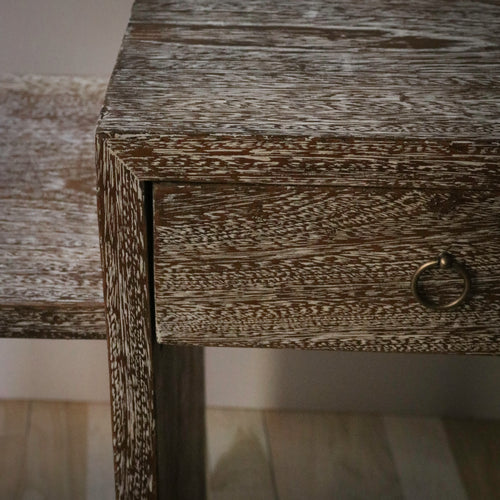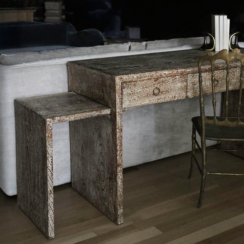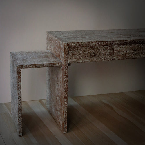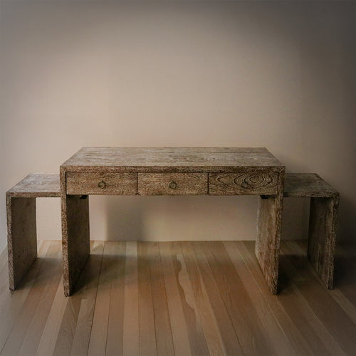 This cerused French oak extension desk is a remarkable example of sculptural utility, embodying the refined craftsmanship of 1940s French modernism. Its linear form and integrated extension benches evoke the work of designers like Jean-Michel Frank and Jacques Adnet, who elevated simplicity into an art form through impeccable materiality and proportion. Cerused oak, a technique originally perfected during the Renaissance and revived in the Art Deco and mid-century periods, enhances the wood’s natural grain with a delicate whitewashed effect, adding both texture and depth. The extension feature allows for adaptable functionality—ideal as a writing desk, console, or even a statement vanity. Now part of the Lemieux Et Cie Vintage Collection, this rare piece exudes the timeless restraint and quiet luxury that define the best of French design.