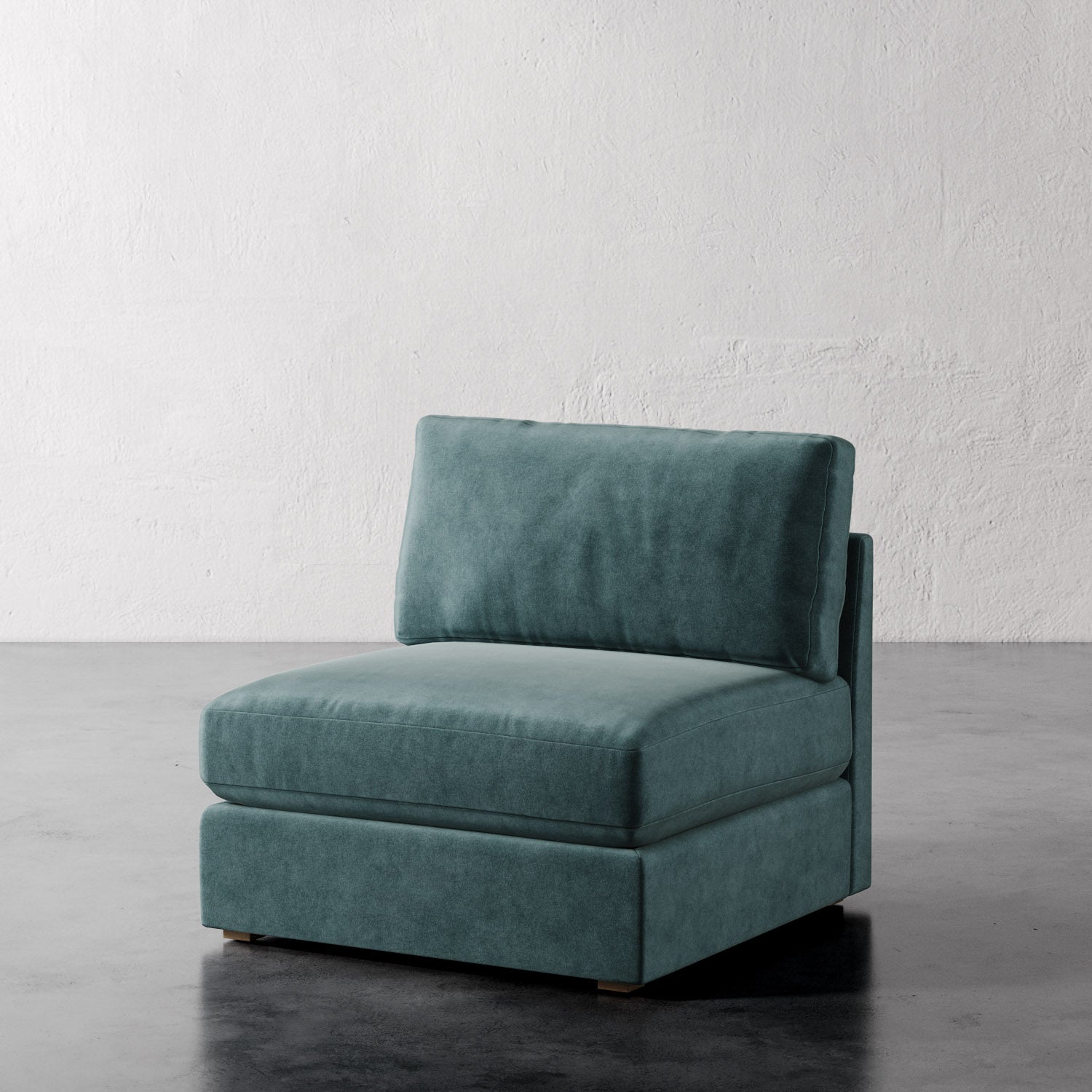 Teal sofa chair on a gray floor with a white textured wall backgroundLemieux Et Cie Chanaux Armless Chair