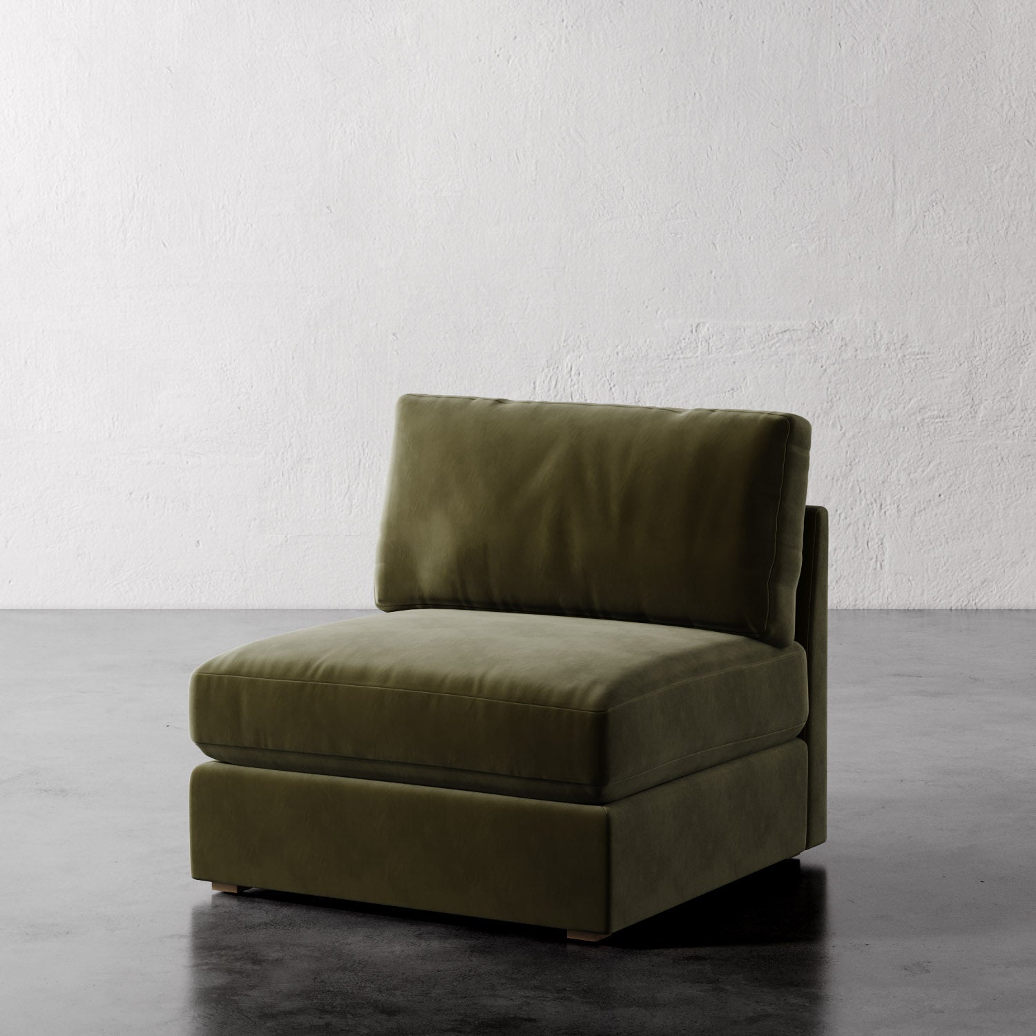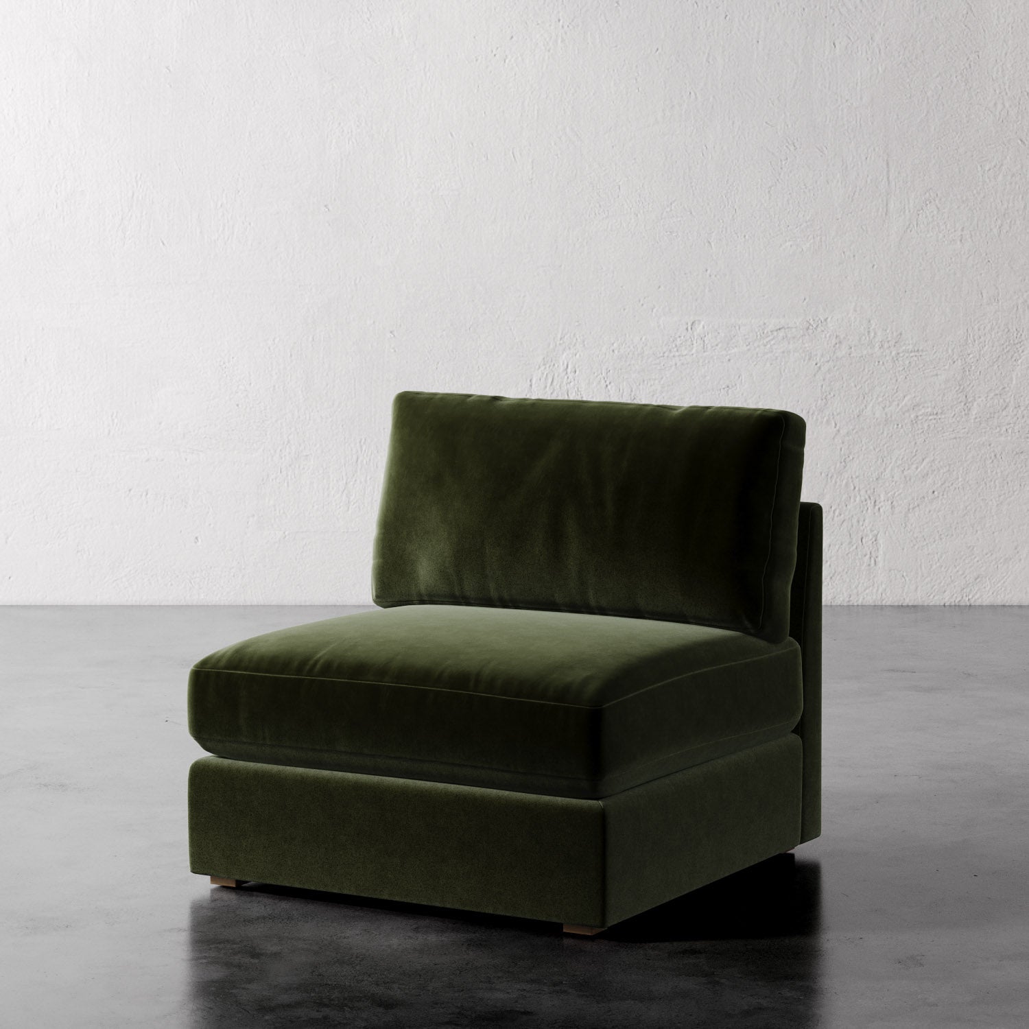Green velvet armchair on a dark floor with a light gray textured wall backgroundLemieux Et Cie Chanaux Armless Chair