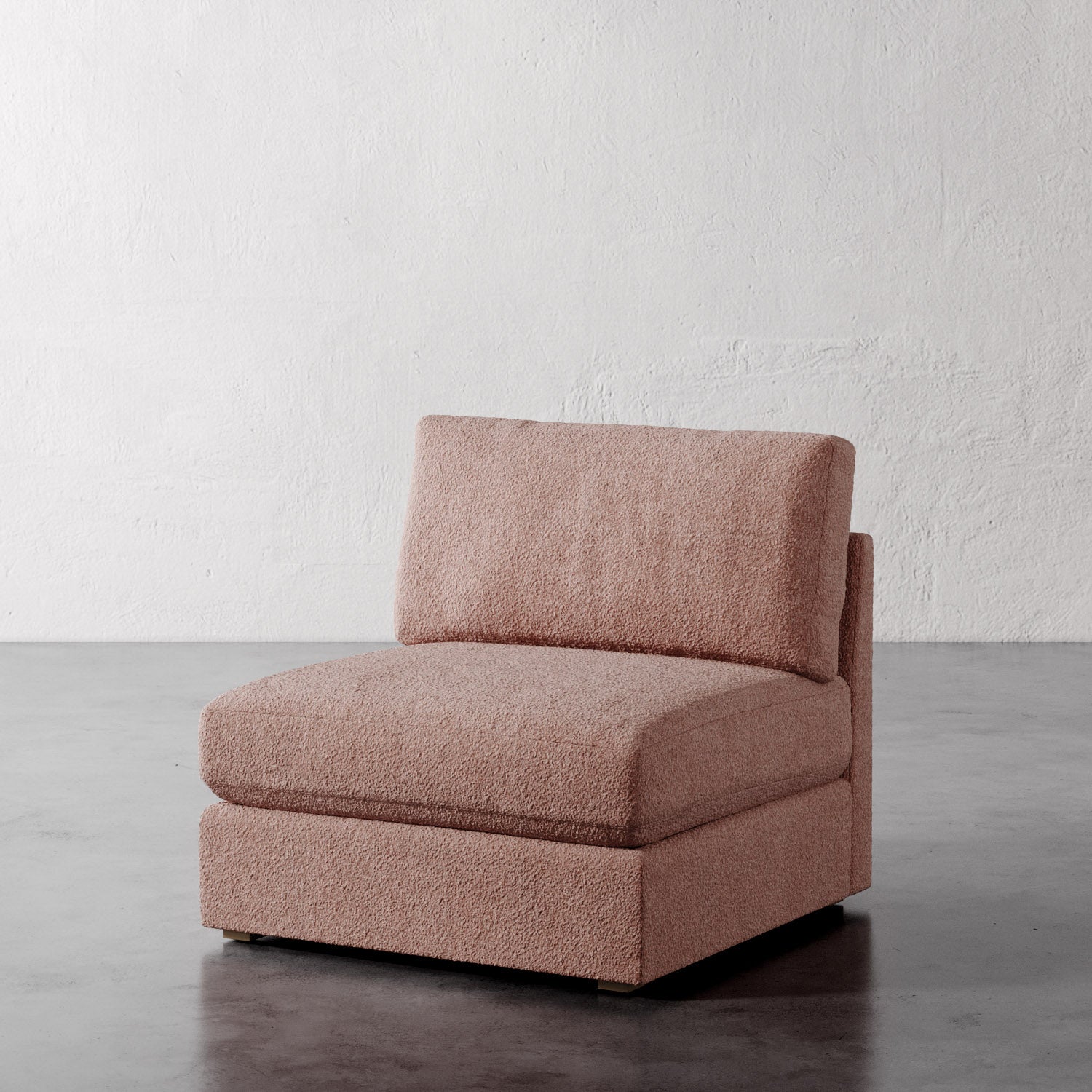 Pink armchair on a gray floor with a white textured wall backgroundLemieux Et Cie Chanaux Armless Chair