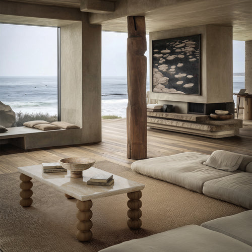 The Chloé coffee table features a generously proportioned rectangular travertine top with a curved profile, perfectly complemented by solid Oak hand-turned legs. The legs are reminiscent of the spool-shaped "bobbin" legs of the 1800s, reimagined with a modern twist. This coffee table combines historical design elements with modern aesthetics, making it a playful and functional addition to any living space. The high-quality travertine and Oak construction ensure durability and elegance, while the unique design showcases the beauty of expert craftsmanship. Perfect for those who appreciate both classic and modern design, the Chloé coffee table is a standout piece in any home decor.
