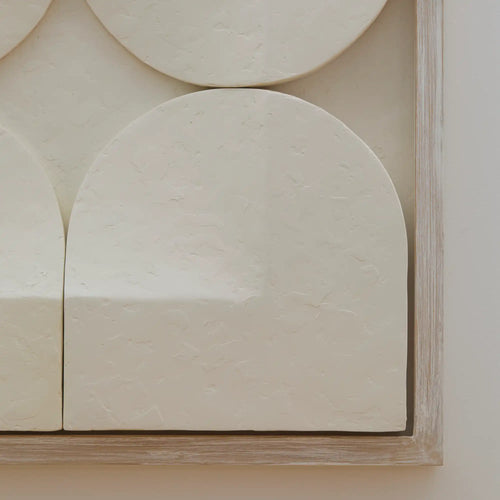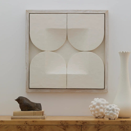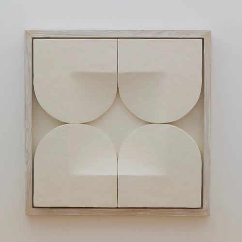 Handcrafted from thick plaster and finished with a hand-painted surface, each element reveals subtle tonal and textural variations. The work is framed in a whitewashed wood frame, its clean lines framing the dimensionality without distraction. At 30” x 30”, it holds the presence of a small-scale architectural wall panel, offering both minimalism and material depth.