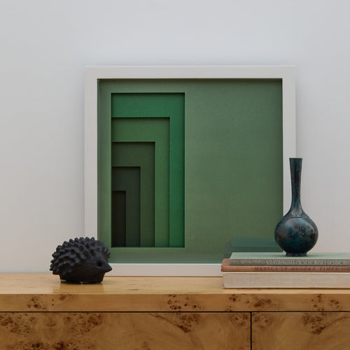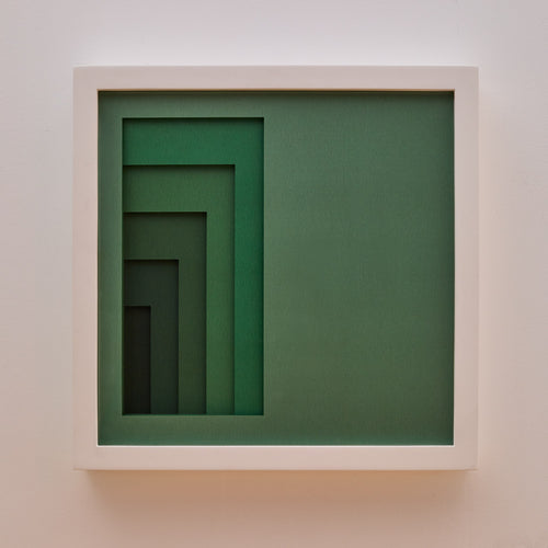 A meditation on depth, shadow, and hue, Composition Tonale No. 3 transforms layers of heavy paper into an architectural study of green. Concentric cut forms recede in precise increments, creating an optical rhythm that changes with light and perspective. The gradation of tone, from deep forest to softened moss, invites the eye inward, evoking both the discipline of Bauhaus geometry and the quiet minimalism of mid-century color field studies.
