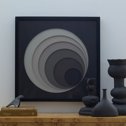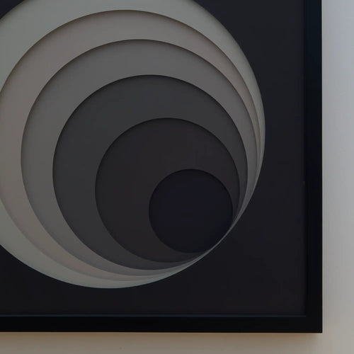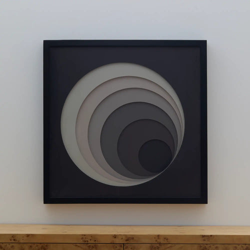 Composition Tonale No. 4 transforms pure geometry into a meditation on depth and shadow. Concentric arcs of heavy card stock are precision-cut and mounted in layers, each gradation of gray stepping inward toward a deep black core. The result is a sculptural play of tonal shifts, where light and perspective alter the visual rhythm with every glance.