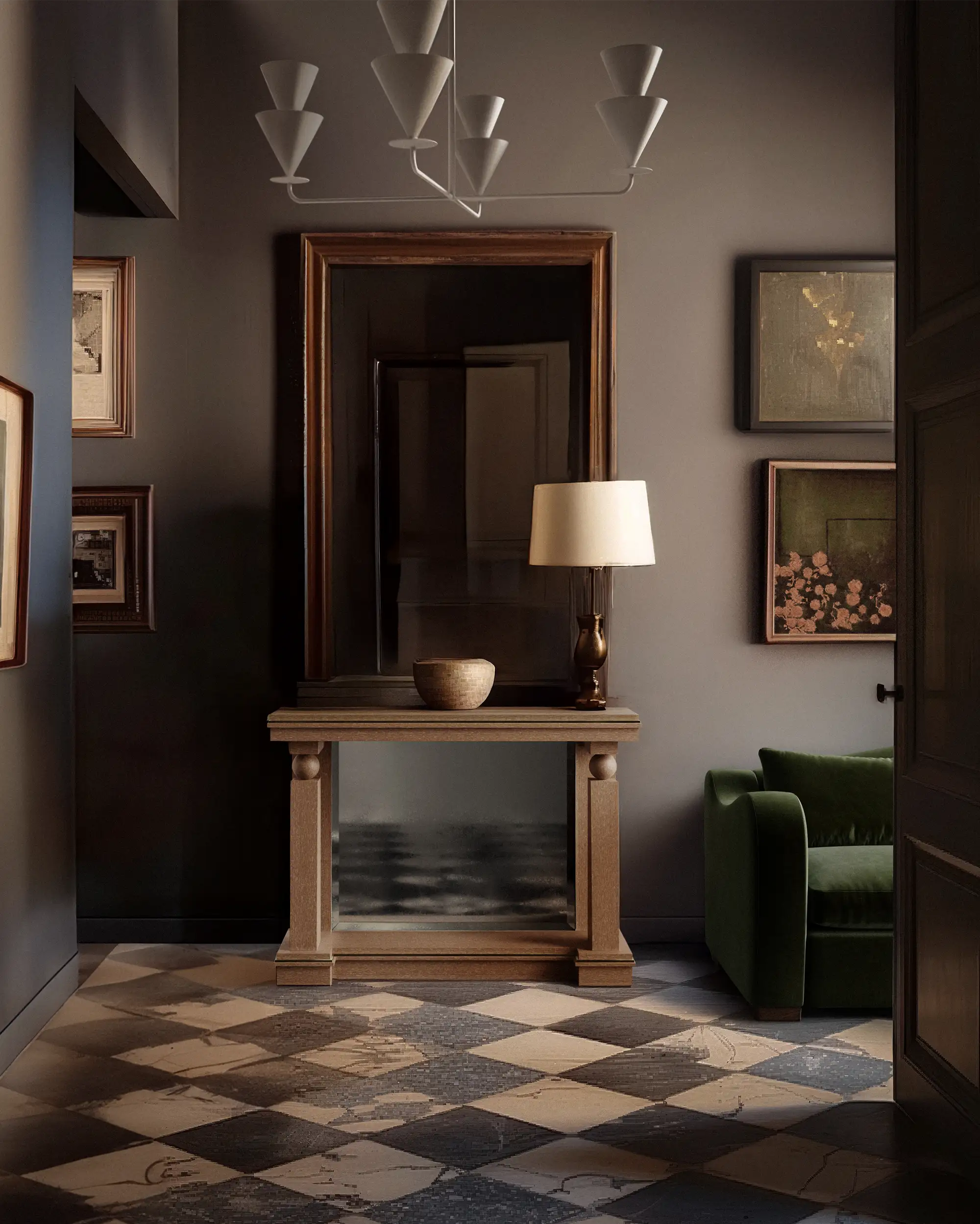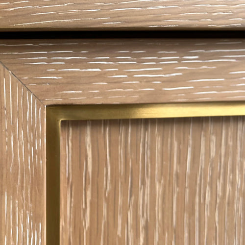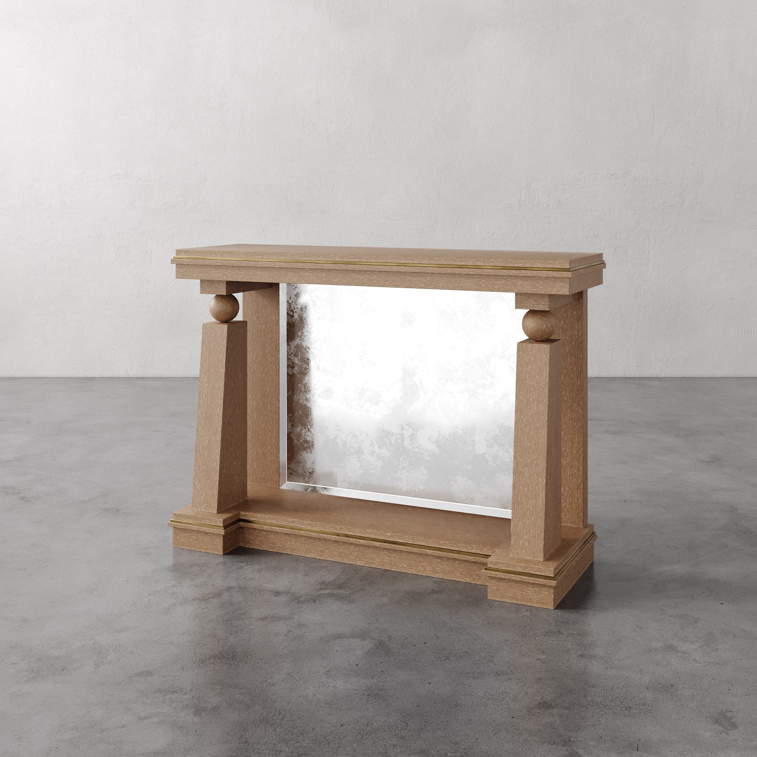 The Corvaux Console Table elevates functional storage into refined design. Crafted in hand-finished oak, its dimensional grain is complemented by cabinet doors inset with églomisé mirror, a traditional French technique of gilding glass from the reverse side to create a subtle, light-catching glow Compact yet luxurious, this small console table is ideal for hallways, entries, or living spaces.