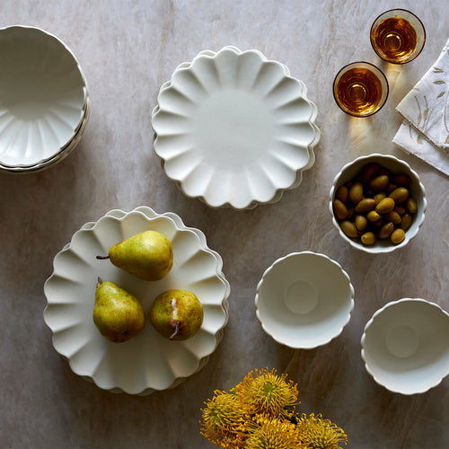 The "Dhalia" dinner set is a modern homage to the rich history of French scalloped dinnerware, famously commissioned by the Kings of France in the 18th and 19th centuries. These regal plates were originally designed to add opulence to royal banquets, their gorgeous curves inspired by the beauty of nature. The "Dhalia" collection, available in white, camel, and blue, carries forward this legacy of luxury through its beautifully scalloped edges, reinterpreting the traditional aesthetic for contemporary entertaining. Each piece has the European refinement of classic French craftsmanship, balanced with modern sophistication, making it perfect for both everyday dining and formal occasions.