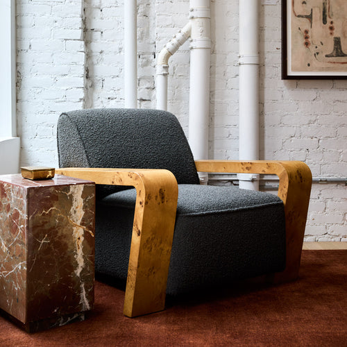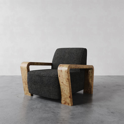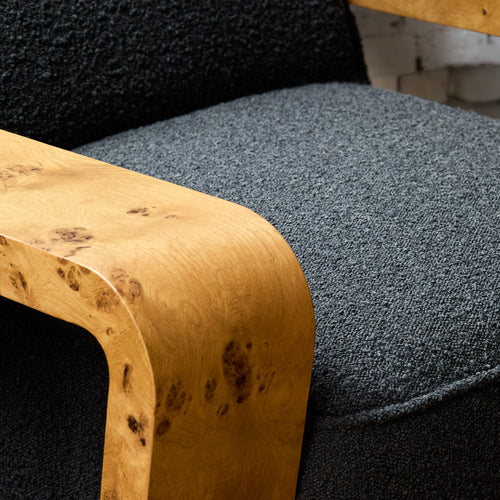 The Dumas Lounge Chair combines a clean, tightly tailored seat and back with wide Oak burl arms, creating a distinctive and inviting design. Its deep seat and curving legs pay homage to the Art Deco lounge chairs of the 1930s, mixing vintage inspiration with modern design. Upholstered in a gorgeous performance grade charcoal boucle, the Dumas Lounge Chair is a perfect addition to any living space, blending classic design with modern comfort.