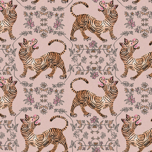 The Ferrandi wallpaper is inspired by the gorgeous rugs and textile fragments of Tibet. Reinterpreted through a modern lens and hand-painted by our artisans, a fierce ambush of Tibetan Tigers prowl through an artisanal landscape strewn with wildflowers.