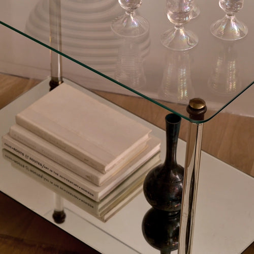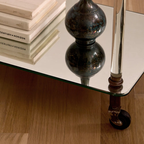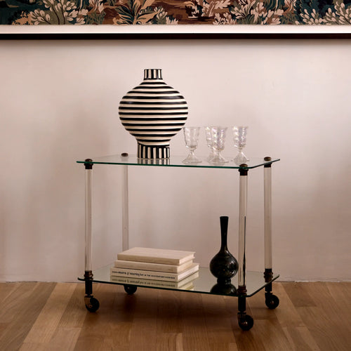 This light and stylish bar cart blends glass and brass in a classic mid-century Parisian design. Sculpted brass accents, smooth-rolling casters, and distinctive glass legs give it a refined look. The top shelf is clear glass, while the lower tier is beveled mirror—both reflecting light beautifully. In the style of Maison Baguès or Maison Charles, it works equally well as a side table or compact bar.