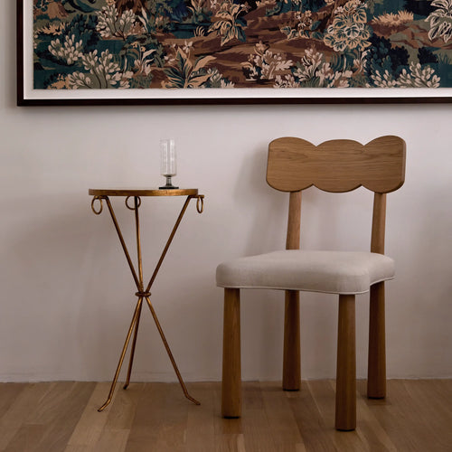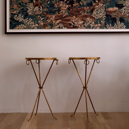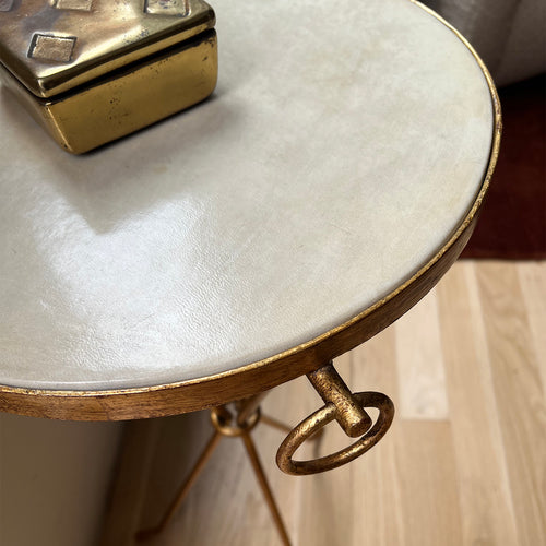 Evoking the quiet grandeur of 1930s Paris, this pair of vintage drinks tables marries the elemental strength of hand-forged gilt iron with the tactile purity of natural parchment. Paying homage to Jean-Michel Frank, master of modern understatement, each form embodies a studied balance between raw material and serene composition.