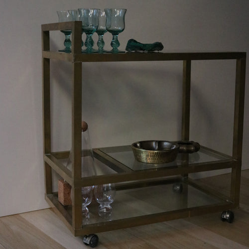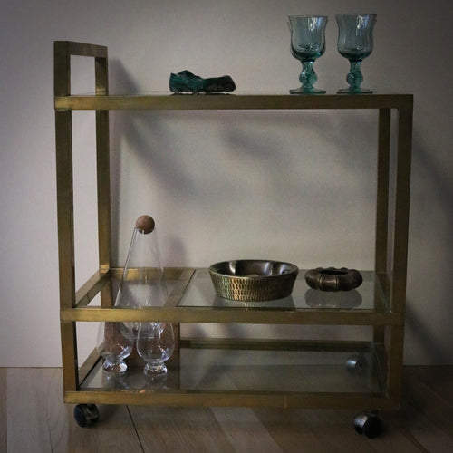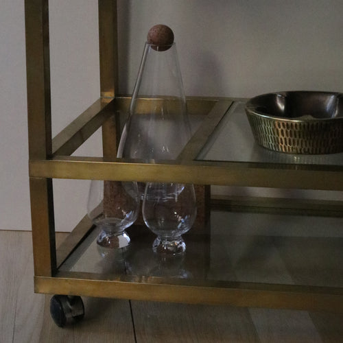 A gorgeous relic of 20th-century entertaining, this vintage brass bar cart—now part of the Lemieux Et Cie Vintage Collection—recalls the golden era of cocktail culture. With its pared-down geometric frame and luminous brass patina, this piece nods to the streamlined modernism of the 1950s and 1960s, when European and American designers alike embraced the glamour of brass and glass. The bar cart, originally popularized in Britain during the Victorian era as a tea trolley, became an essential fixture of mid-century entertaining, a symbol of effortless hospitality and sophisticated living. Rolling with ease from one gathering to the next, it remains a timeless accent for contemporary interiors, blending form and function with an air of classic indulgence