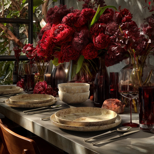 A complete service for four people: dinner plates, salad plates, bowls, and mugs, all finished in Hanami's signature reactive glaze. Artistry and practicality in balanced harmony. The Hanami Stoneware Collection uses a reactive glaze, a traditional mineral-rich technique that blooms during firing and creates soft shifts in tone and texture. This process gives each piece its own distinct variation, so no two are exactly alike. Made from durable stoneware and fully dishwasher-safe.