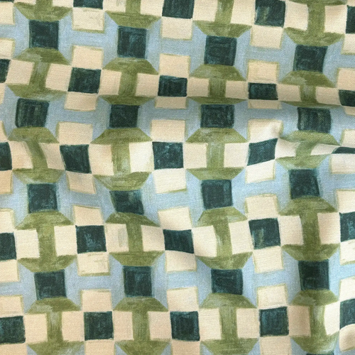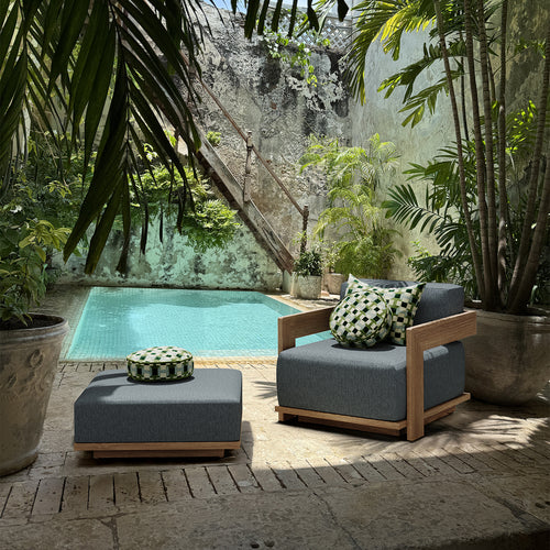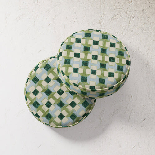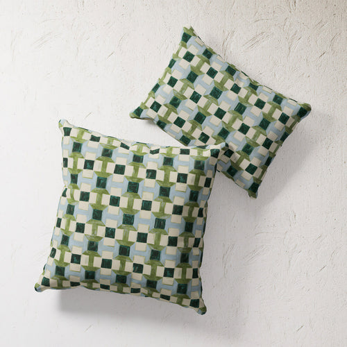 Designed in-house and inspired by fragments from our vast archives, the Geometric Green and Blue abstract geometric pattern is intended to be mixed and matched for a richly layered space - whether indoor or out. Adorn a neutral sofa or chaise with our other cool hues for a tonal look. Each double-sided printed pillow is mildew proof and has UV and water resistant properties.