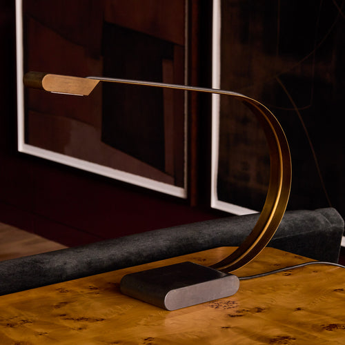 Vintage 1980s Italian halogen table lamp in a sleek postmodern design. Minimalist metal frame anodized in brass sits atop a grey metal base with a two-level brightness switch. Its sculptural arc combines striking visual appeal with practical task lighting for your desk or workspace.
