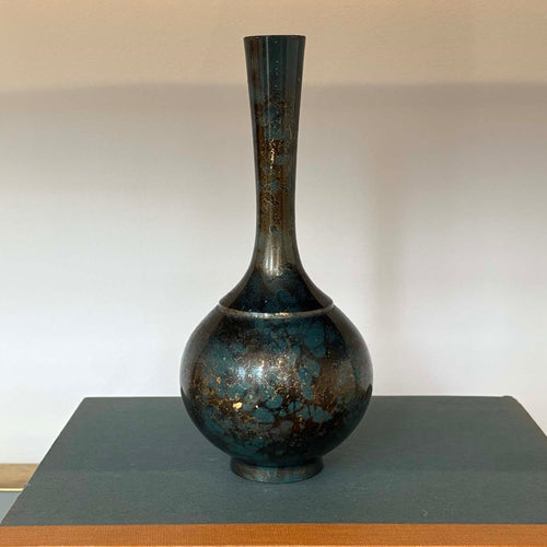 A clean-lined and striking bronze vase from Takaoka, a city in Japan’s Toyama prefecture renowned for its centuries-old bronze and copper craftsmanship. This piece features a unique mottled patina created using the murashido technique, where oil is applied to heated bronze for rich, layered texture and tone. The result is a stunning mix of blue, black, and metallic gold flecks.