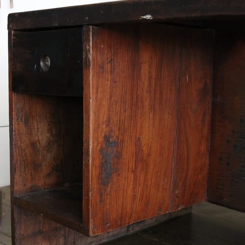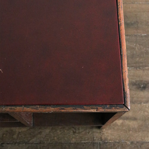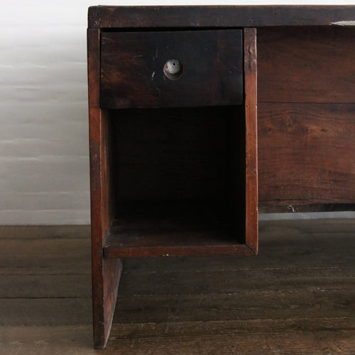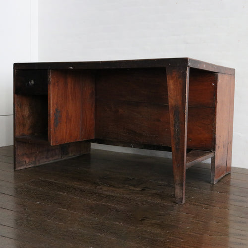 An increasingly scarce teak mid-century desk by legendary designer Pierre Jeanneret. India, circa 1957 - 1958, for Chandigarh projects. Designed for various administrative buildings in the city. Oxblood re-covered leather top. A single drawer to the front, open pigeonhole shelving to the reverse ideal for books and curios to create and artistic display.