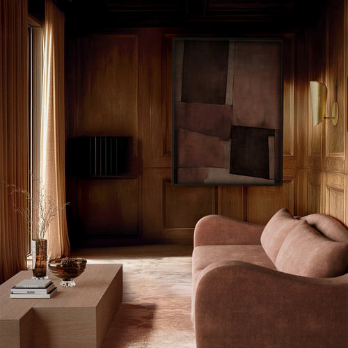 Introducing "Le Havre", a limited edition, signed and numbered print that captures the renowned landscape of Le Havre bathed in the fiery hues of sunset. This geometric abstract, alive with tones of cinnamon, blush, and taupe, evokes the warmth and mystery of dusk over the horizon. Created in gouache, charcoal, and graphite, each piece reflects a sophisticated interplay of color and form.