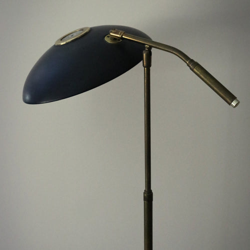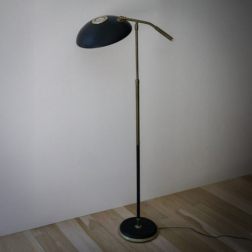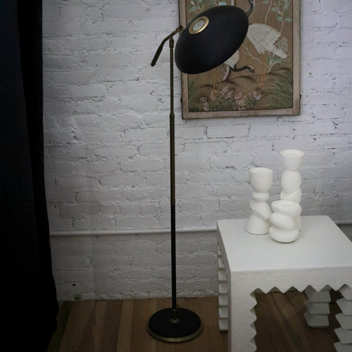 A masterful example of mid-century American lighting design, this black and brass floor lamp by Gerald Thurston for Lightolier is both functional beauty and sculptural shape. Thurston, one of the most influential lighting designers of the postwar era, was known for his innovative, adjustable designs that balanced modernist minimalism with practical sophistication. This piece, with its articulating arm and signature saucer-shaped shade, exemplifies the sleek, industrially inspired aesthetic that defined Lightolier's golden age in the 1950s and 60s. Designed for both task and ambient lighting, it offers versatility and refinement—hallmarks of Thurston’s approach.