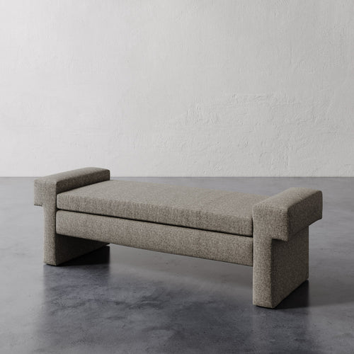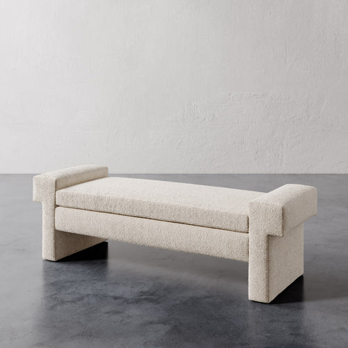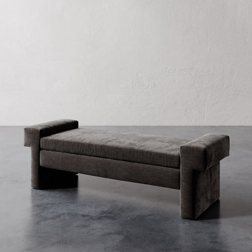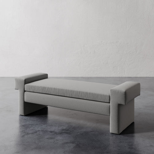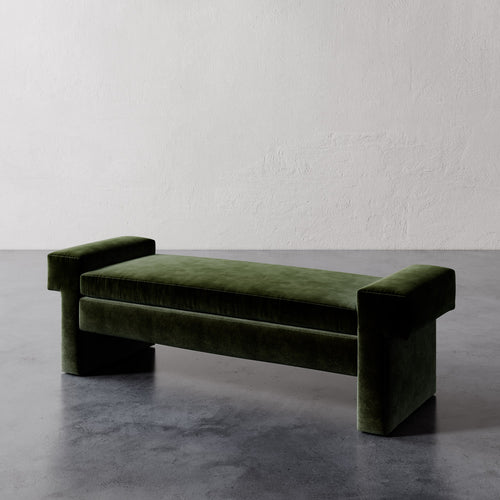 The Lemaire Bench from Lemieux et Cie is a study in architectural purity, its linear silhouette and sculpted form recalling the disciplined elegance of modernist design. With a nod to the Barcelona Pavilion and the precision of early 20th-century architecture, its structured shape balances bold geometry with refined proportions. The upholstered arms and seat add a sense of softness to its rigorous lines, making it as inviting as it is sculptural. A true intersection of form and function, the Lemaire Bench is a striking yet versatile piece, ideal for anchoring a space with quiet sophistication.
