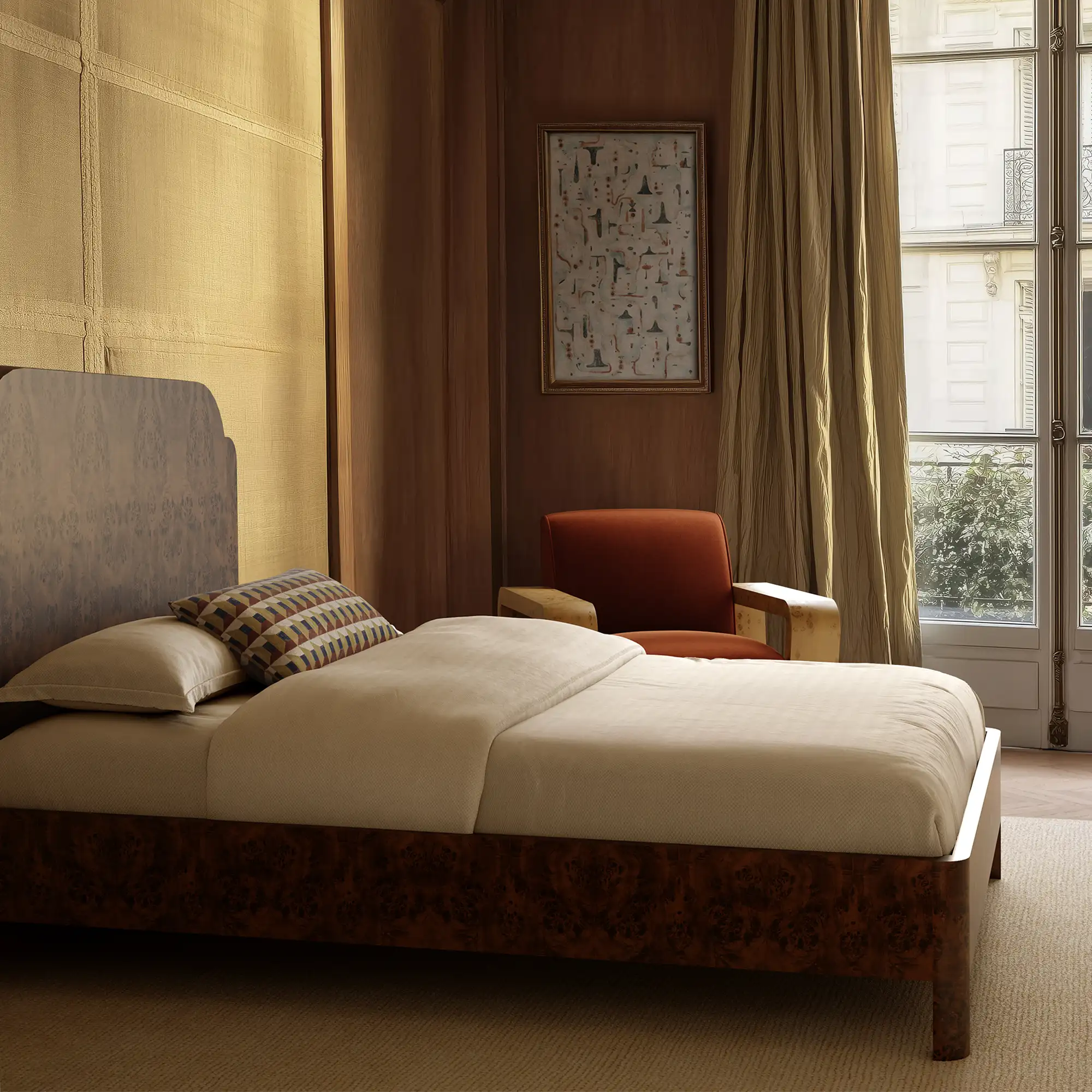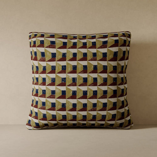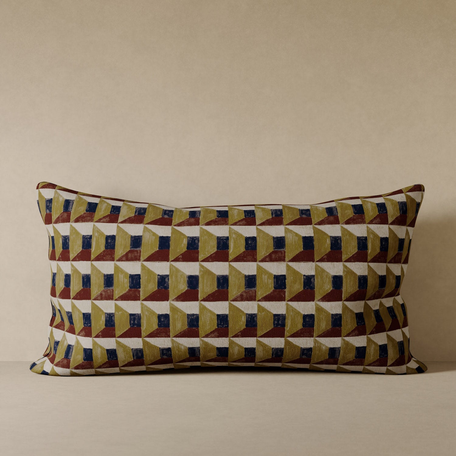 A modern nod to the art of illusion, the Les Cubes accent pillow transforms hand-painted geometry into playful dimensionality. Inspired by early 20th-century European decorative arts, the design layers shadow, brushstroke, and earthy tone to evoke sculpted depth. Crafted in JB Martin performance velvet and made to order in the USA, it brings visual wit and refined structure to any setting.