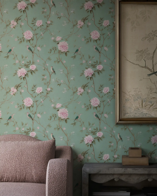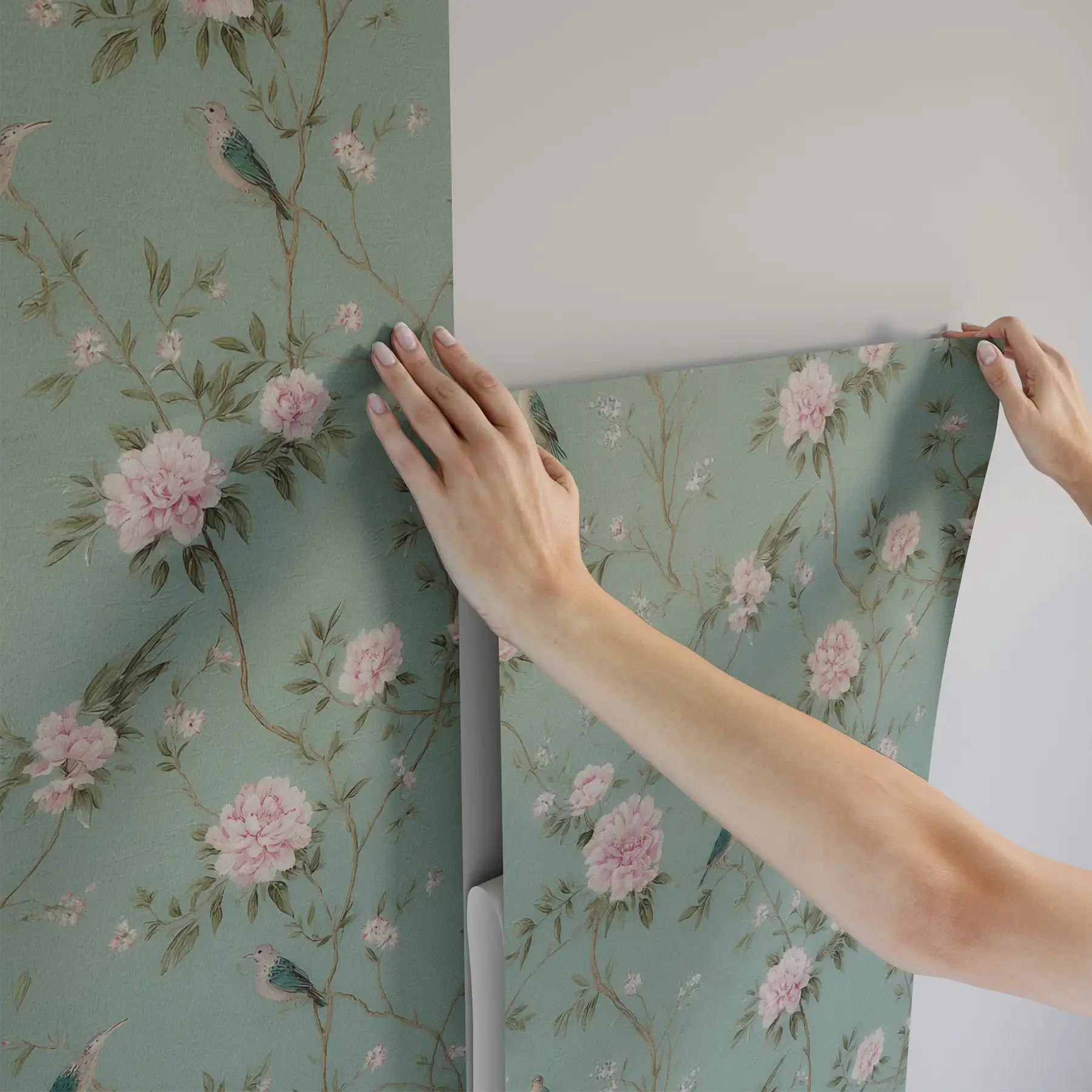 Delicate branches, soft peonies, and small songbirds unfurl across a serene celadon background in Lucienne, inspired by the graceful painted panels that once adorned European salons. Designed in an effortless peel and stick format, it brings quiet romance and balance to modern interiors.
