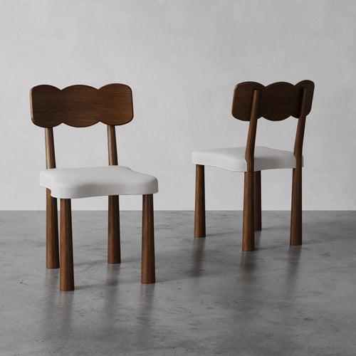 This modern solid Oak dining chair in a rich walnut finish features a unique bow-shaped back and a contoured upholstered seat. The seat is crafted for comfort and made with a woven performance-grade fabric that protects against spills and stains, ensuring longevity. The combination of the shaped back and the sturdy oak construction creates a distinctive and functional piece perfect for any dining area. Available in both Oak and Walnut finishes.