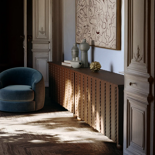 The Marchand Cabinet draws on the lineage of early 20th-century French craftsmanship, offering a composition that feels both enduring and quietly modern. Elegantly hand-carved scalloped edges and a richly textured facade create a subtle rhythm, celebrating time-honored woodworking traditions.