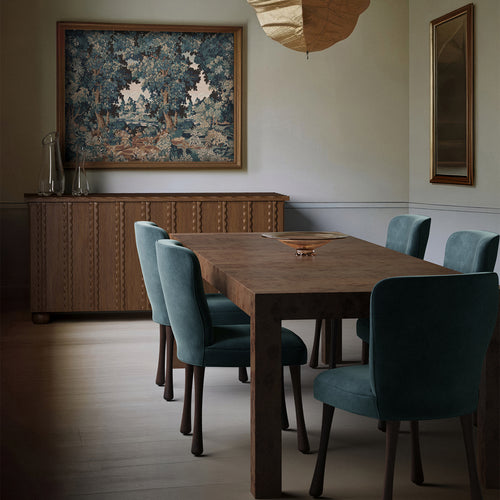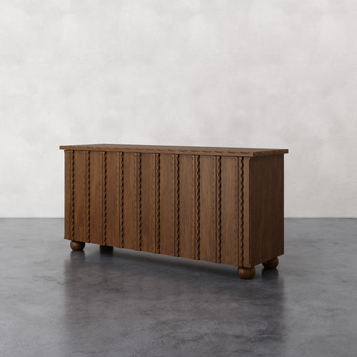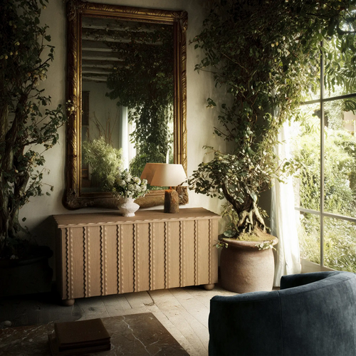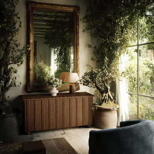 The Marchand Cabinet draws on the lineage of early 20th-century French craftsmanship, offering a composition that feels both enduring and quietly modern. Elegantly hand-carved scalloped edges and a richly textured facade create a subtle rhythm, celebrating time-honored woodworking traditions.